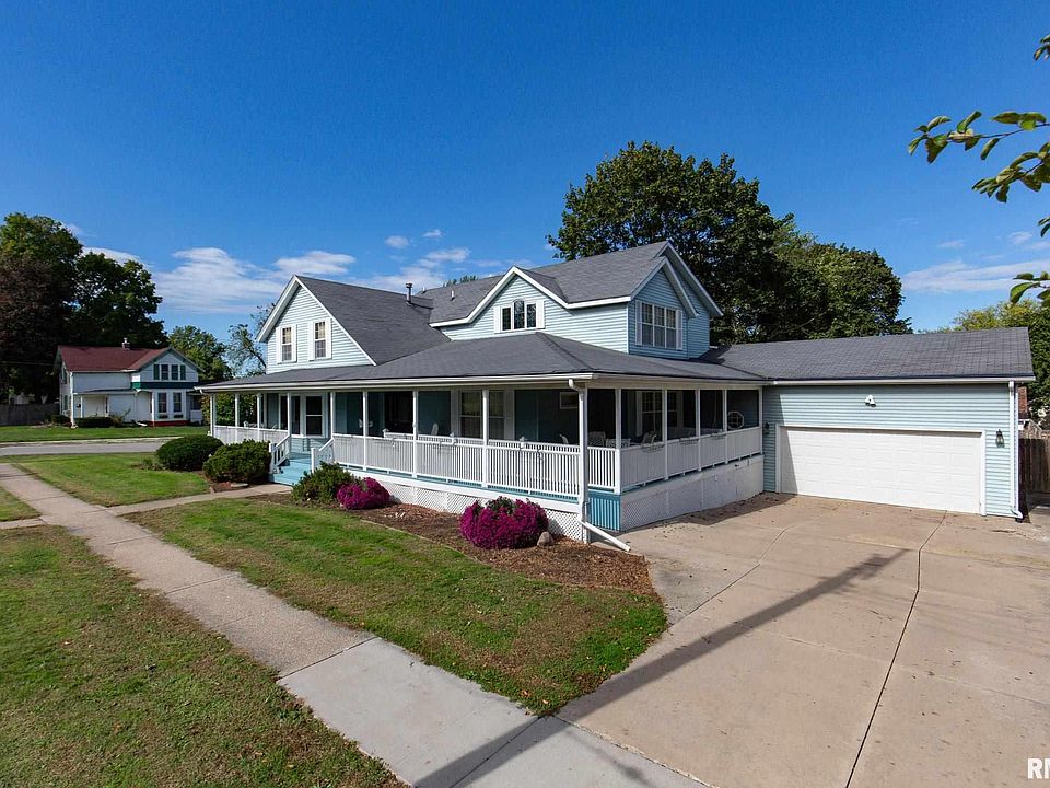 Beautiful Victorian with sweeping wrap around porches has 5 bathrooms & potential of 5 bedrooms. ( office/den on main level identifies as a bedroom) Home has updates too numerous to list! $45,000 kitchen renovation install by Chicago Street Decor, Geneseo...IS STUNNING! $20,000 master suite renovation w/ private dressing room & professional lighting at the make-up vanity Newer windows, new tile flooring & carpets. Huge rec room w/ eye catching wet bar area. Sweeping corner lot. Oversized 2 car garage with workshop area, living room has gorgeous brick surrounding the wood-burning fireplace. Enjoy your favorite beverage sitting in the 4 season room w/ nature views in the privacy fenced yard. Lots of original woodwork & original Victorian stained glass windows. Bedroom #4 is non-conventional. All upper bedrooms have their own private bathroom. Home has been professionally & meticulously cleaned & MOVE IN READY.