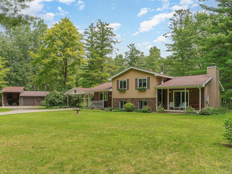 This country home is a slice of heaven on Ehlers Rd! This immaculately maintained property is situated on 6 acres in Larkin Township and close to all conveniences. The property is a cozy 3bedroom/2full bath home which has the cleanliness, character and beauty of the homestead you've been looking for. The kitchen has solid oak cabinets, Corian counters, tile backsplash, stainless appliances with gas range, pantry, island, wood floors and an added bonus...vaulted ceiling with tons of natural light to bring in the beauty from outside as well. One of two living rooms features a brick, natural burning fireplace and could be converted into an oversized master suite. The lower-level family room has a wood burning stove, luxury vinyl flooring and is the perfect space for family Christmas and making memories for years to come. The upper level has three bedrooms and a double vanity full bathroom with tile flooring. The exterior of the home has two front porches for relaxing and an oversized back deck for entertaining and watching wildlife. Situated next to the house is a spacious carport with concrete floor. There is a large detached four car heated garage with 14ft opening for a camper, boat or rv storage and two doors with openers. Inside the garage are concrete floors, 100amp electrical and a separate 220fuse box for a generator hook-up. A homestead wouldn't be complete without your very own horse stable with chicken coop and potting space. Above the horse stable is a flex space that was used as an art studio or she shed that has great lighting, electrical and a wall heater. The house and buildings are surrounded by wooded acreage with hard maples trees for tapping maple syrup and all the privacy and wildlife you've been looking for. Come see this well-manicured, one owner homestead and feel the love it has been shown over the years. Schedule your private showing today. **Seller IS MOTIVATED!**