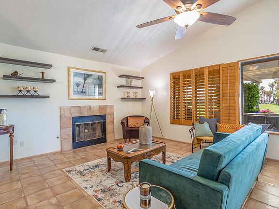 This home is all about the location, location, location. The home offers breathtaking views of the lush green golf course, picturesque mountains, and a serene lake. For those who love outdoor entertaining, the extended, wraparound patio on one side of the home is a must-see. Covered and spacious, it feels like an additional room. Picture yourself sitting on the patio, listening to the gentle sounds of the lake's fountain or watching the shadows as the sun sets. This is why our Desert is so special.The home features tile flooring throughout, plantation shutters, a cozy fireplace in the living room, and a Kitchen with a pantry. There is also a cozy office/TV room that was created from the 2nd bedroom. The Master shower has been also enlarged. If you play golf there are several golf memberships available to choose from. Oasis is not age restricted and has a reputation of being one of the friendliest communities around. The clubhouse has recently been remodeled beautifully and features two restaurants , a card room, lending library and a pro shop. Homeowners can also enjoy 18 pools and spas, an 18-hole putting course, and a dog park. We also have citrus trees on the property for homeowners to enjoy.