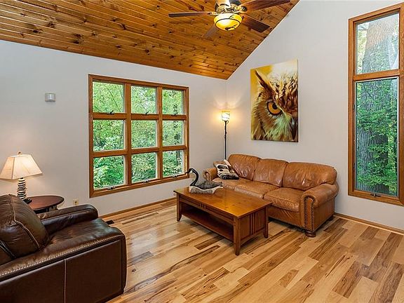 This home has the 'cabin in the woods' feel that you've been looking for. Situated on almost 1.4 acres and surrounded by trees, you'll forget that you are in the city. If the first impression of the home hasn't already amazed you, just wait until you step inside this 4 bed, 4 bath home. Highlights you'll notice right away: the vaulted planked ceilings, bonus skylights, solid hickory floors and the abundance of windows. You are truly immersed in nature everywhere in this home, inside and out. The kitchen is updated with warm cabinetry, soapstone counters & large island perfect for entertaining. The upper level features a spacious master suite with vaulted ceiling, walk-in closet as well as 2 more bedrooms & bath. The finished walkout lower level is perfect for relaxing with friends & family. You'll spend more time outdoors relaxing and watching the wildlife on the huge wrap around deck. This home also features a 30x34 storage building with separate driveway (rents for $225/mo)