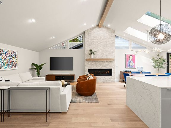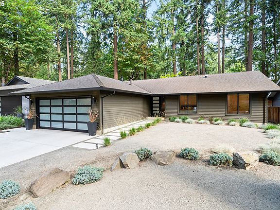 No detail was overlooked in this updated single-level home, which combines sophisticated modern design with quality finishes throughout. The open floor plan features vaulted ceilings with box beam, sleek linear gas fireplace, three large skylights, and oak wood floors that flow through every room. The kitchen is ideal for both daily living and entertaining, with a large waterfall edge island, KitchenAid appliances, and custom cabinetry. The primary suite is equally impressive, offering a walk-in closet with built-in organization and a spa-like bathroom with extensive tilework, a freestanding tub, and a custom floating vanity with quartz counters. Step outside to a professionally landscaped backyard with plenty of space to host or relax in nature. Conveniently located just blocks from Mercato Grove, Kruse Village, Lake Grove Village Center, Waluga Park, and Lake Grove Elementary, with quick access to I-5 and Hwy 217. This one is a must-see!
