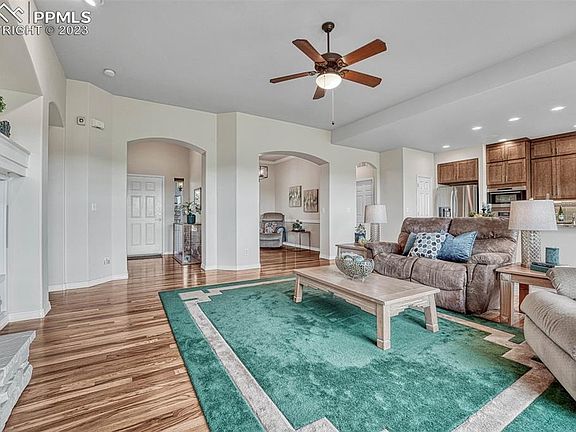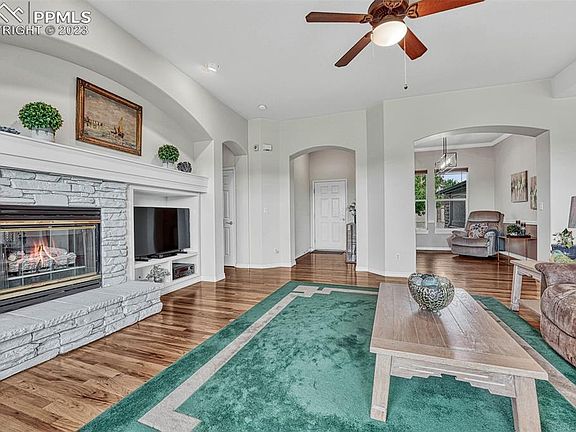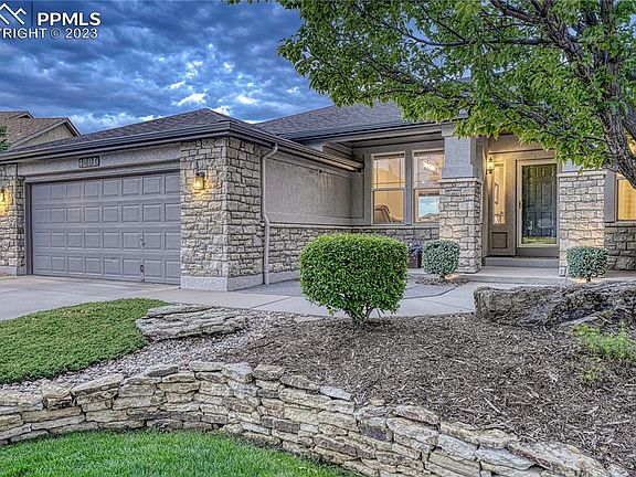 Immaculate, stunning stucco/stone rancher on a 0.21 acre lot in Springs Ranch. Backs to open space planned to be developed into Coleman Community Park. High ceilings, archways, lighted CF’s, & natural wood floors through much of the ML. Central air for year-round comfort. Covered Entry w/storm door leads into the Great Room which offers a gas-log FP w/stacked stone surround, built-in TV recess w/art niche & wall of windows w/ top-down, bottom-up shades. The front Flex Rm (currently a Sitting Rm) can be used as a Dining Room. The upgraded Island Kitchen boasts a tile floor, pantry & expanded custom cabinetry w/gorgeous granite counters & glass subway tile backsplash. Appliances incl a farm sink w/hot water tap, 5-burner cooktop, upgraded vent hood, dishwasher, French door refrigerator, built-in oven & steam/convection oven. The Bay Nook opens to the expanded deck to enjoy Mtn views. Garage access & Laundry Rm w/ cabinets & washer/dryer are off Kitchen. ML Office w/ french doors, built-ins & closet could be 5th BR. ML BR2 (currently used as office) has adjacent Hall Bath w/ tiled shower. The ML Primary BR has a bay window, access to deck & 5 pc Bathroom. The Primary Bathroom features a dual sink vanity, soaking tub, tiled shower & walk-in closet. The walkout Bsmt offers a large Rec Rm w/ gas-log FP, game area, TV area w/ entertainment center & wet bar w/kitchenette. There are 2 more BRs w/ huge walk-in closets, a Full Bath & Storage Rm w/built-in shelves. Walk out to a backyard patio for outdoor relaxation. Fenced backyard w/auto sprinklers, raised garden, partially covered wood deck w/ iron rails, patio, & even a dog run. Extras incl 2 furnaces, a humidifier, sec sys & sur sound to the deck, Nook & Primary BR. 3-car tandem garage w/service door, epoxy floor & utility sink. This is an amazing home located near Powers corridor shopping, entertainment, restaurants, D-49 schools.