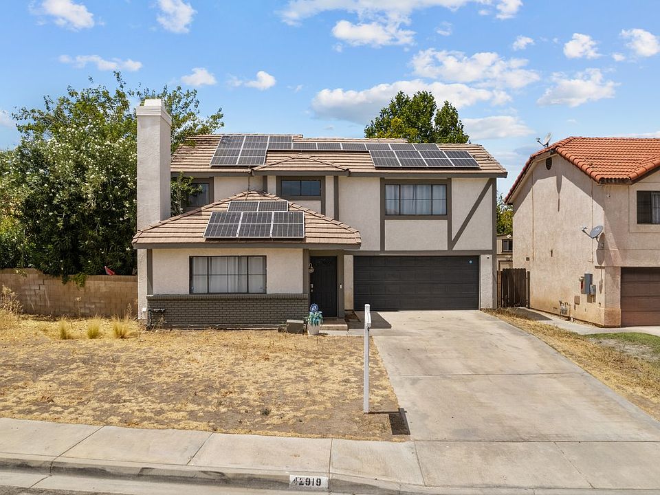 Presenting an exquisite two-story residence nestled in the charming neighborhood of Lancaster, complete with the eco-friendly advantage of solar panels and a convenient attached two-car garage. This splendid abode boasts a well-lit and inviting floorplan, encompassing three bedrooms, three bathrooms, and a generous 1,913 square feet of living area. Elegance abounds in every corner, with laminate and tile flooring gracing the interior, complemented by tasteful lighting fixtures. Abundant storage solutions are seamlessly integrated, including a dedicated laundry area for your convenience. The home offers both a spacious living room and a cozy family room adorned with a charming fireplace. Indulge your culinary aspirations in the well-appointed kitchen, replete with a central island, sleek countertops, stainless steel appliances, and pristine white cabinetry. The bedrooms are havens of comfort and light, each adorned with a ceiling fan/light fixture and ample closet space. The primary bedroom stands out with its luxurious walk-in closet and an en-suite bathroom featuring dual sink vanities for added privacy. Beyond the interiors, the exterior presents an expansive yard, offering plenty of room for outdoor activities and relaxation on the patio, all enveloped in a setting of tranquility and seclusion. The canvas is open for your creative ideas to personalize and transform this space into your dream oasis. Conveniently situated, this home enjoys a prime location in proximity to Stater Bros Market, Walgreens, an array of popular dining establishments, schools, and more. Embrace the opportunity to shape this residence into your own haven in an enviable locale.