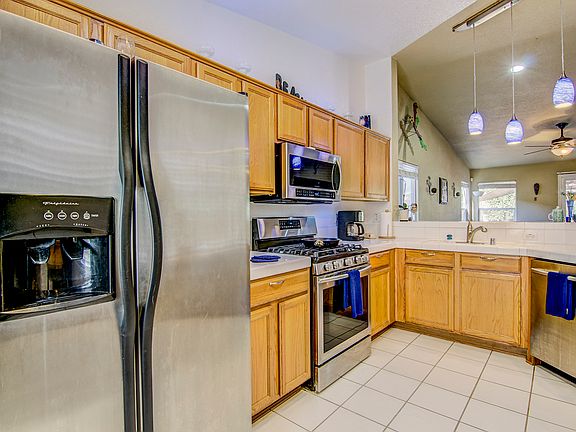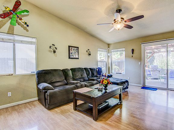 Beautiful contemporary well loved single story home with vaulted ceilings is the perfect floorplan. This home is considered a three bedroom two bath but third bedroom is used as a den with no closet or doors, can easily be converted back. Laminate and tile flooring, gas fireplace, newer stainless steel appliances with upgraded pendant lights above kitchen bar counter. Enjoy cozy backyard with small pond and spa plus built in patio for entertaining. Updated bathrooms with designer colors throughout home. Great location and neighborhood. HOA covers front yard maintenance too. Call today for a private showing!