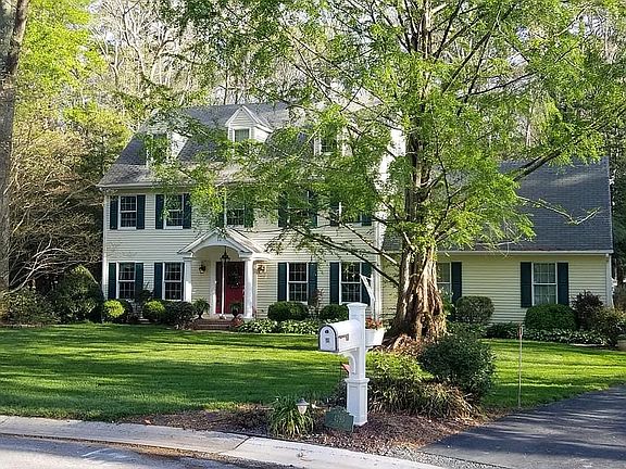 BUYER’s AGENTS WELCOME!! Lovely colonial situated on a large wooded lot on a cul-de-sac. Custom landscaping with fire pit, large two-tiered deck with gas hook-up, and hot tub. Inside the house features custom cabinetry in the kitchen with an island and cooktop, a large laundry room with pantry, formal dining room, family room with wood stove insert, formal office/living room and 1/2 bath comprise the first floor. On the second floor: master bedroom with updated master bath, California walk-in closet and bonus room, three additional bedrooms and hall bath. The third floor has an additional bedroom with custom built-ins, full bath and theater/entertainment room with wet bar. Crawl space fully encapsulated in 2021.