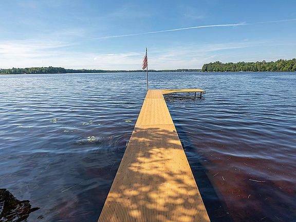 This Moen Chain home and year-round cottage are located on 2.75 semi-private acres with 480+/- feet of south-facing, mostly sand frontage. The east boundary borders the Gudegast Creek. The main home features spacious, vaulted, open-concept living areas. A stone, wood-burning fireplace and lake-facing windows and French patio doors provide focal points. The gourmet-style kitchen with solid-surface countertops, double ovens and two-tiered breakfast bar overlooks a dining area that leads to an enclosed porch and a deck overlooking the lake. The owner’s suite has its own ¾ bathroom and lake-facing deck. Another bedroom and full bathroom complete the main level. The finished walk out lower level provides additional living space, including a full bathroom and a utility room. An enclosed breezeway leads from the home into the 2-car attached garage. The guest cottage has a large living room with vaulted ceiling, small kitchen, 2 bedrooms, a full bathroom and an enclosed three-season porch.