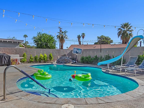 Cute and open floor plan with all the upgrades you could need: remodeled kitchen with stainless appliances, full Italian granite backsplash and slab counters; gorgeous pool with sparkling tile fountain and well-laid out back yard including covered eating area with television hook-up and great mountain views; fabulous enclosed sun room with windows on 3 sides overlooking the pool; diagonal tile throughout the home; plenty of storage and inside laundry! Plus, newer windows and AC with smart thermostat. This home has been lovingly cared for by the same owners for many years and it shows. You will not be disappointed! 3rd bedroom and sunroom were converted prior to their purchase and based on square footage in title, are likely not permitted. Buyers to do their due diligence.