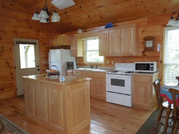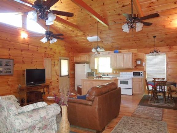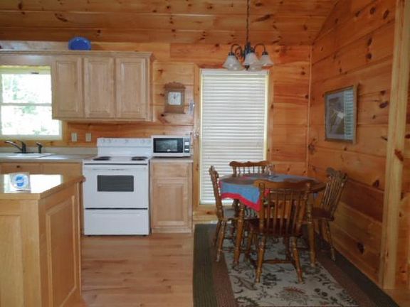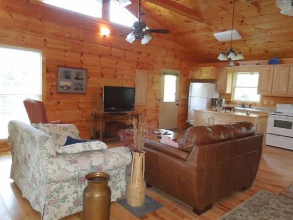 49.19 surveyed ac with an awesome 1BD/1BA, 976 sq ft rustic cabin located in a country - rural location. Open concept kitchen with island and living room with vaulted wood and beam ceilings. Pine wooded knotty walls and ceilings and maple kitchen cabinets. Hemlock wood exterior with a side - back open deck and a front covered deck. Large & wide concrete driveway for an easy access. Over 1 mile of road frontage off of two roads. Approx 1 to 2 ac of open level land the remaining is in level - rolling - slopping and steep terrain. Loads of wildlife and great hunting. No restrictions. Year around creek at the back and easy access to it from the back road.