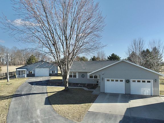 10 Acre full finished ranch Horse property! This 3 bedroom 3 bathroom home features open floor plan, main floor laundry, main floor owners suite with walk in closet and private bath, main floor office/den, attached 676 sqft garage, quartz kitchen countertops, stainless steel updated appliances, in home dehumidifer, kitchen tile backsplash, LVP flooring, installed radon mitigation system, built in surveillance system, lots of storage throughout and more. Looking outside enjoy your covered maintenance free deck, white vinyl picket fence to frame the property, RV storage, steel pole shed with concrete and electrical and perfectly set up for Horses including fencing and Auto water feeder. Don’t miss this stunning property just 15 min north of Rochester.
