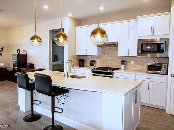 Welcome to your dream home in Babcock Ranch Parkside neighborhood! This stunning single family Summerwood model home by Pulte boasts 3 bedrooms (or 2+den), 2 bathrooms, and an oversized 2.5 car garage with over $140,000 in builder upgrades. The kitchen features Level 5 Quartz countertops, Whirlpool stainless steel appliances, and a marble backsplash, making it a chef's paradise. The open concept living area is perfect for entertaining. Step outside through your zero-corner pocket sliders onto an oversized screened lanai, complete with sun/privacy shades on the west side for added comfort.