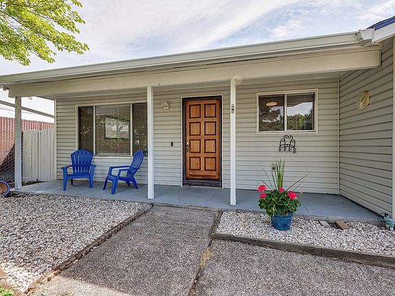 Nestled in a peaceful setting, this beautifully positioned home offers a serene retreat with an inviting front yard with large covered porch and an expansive, fully fenced private backyard. A spacious covered patio with two skylights creates the perfect space to enjoy quiet mornings and relaxing evenings in your own outdoor oasis. Conveniently located, the property provides easy access to major freeways, parks, bike trails, shopping centers, and schools. Downtown Salem is just a short drive away, offering all the amenities and conveniences of city living. This light-filled, single-level home features an open and airy layout, beginning with a welcoming entryway that flows into a bright great room and spacious. The open-concept design seamlessly connects the great room, kitchen, and formal dining area—ideal for both everyday living and entertaining. The kitchen offers generous cabinet storage and a built-in microwave. Sliding doors from the dining room lead directly to the covered patio, extending the living space outdoors. The home includes two spacious bedrooms filled with natural light. The primary suite features its own private bathroom with a skylight, built-ins, shower, and walk-in closet. Durable laminate flooring runs throughout the entire home, adding both style and functionality. Additional highlights include a central heat pump system, a newer roof, fresh interior paint, updated main bathroom, newer water heater, and a new garage doors equipped with a smart camera-enabled opener. The backyard is perfect for gardening enthusiasts, complete with mature fruit trees and a shed for tool storage. This property offers the perfect blend of comfort, convenience, and charm—truly a must-see!