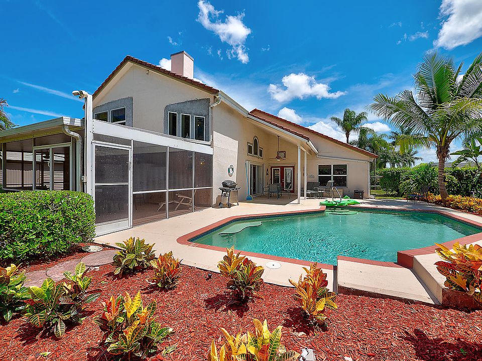 Come see this remarkable 4 bedroom, 3 bathroom home on a huge property of over half an acre, Spectacular pool area for entertaining and complemented by an additional spacious covered screened patio ideal for those great parties. Delight in your Primary bedroom which is designed for comfort with real wood flooring, ceiling fan, and large walk in closet with custom shelving. The bath offers double vanities with wood cabinetry, walk in shower and roman tub. Relax with family and friends in this spacious family room with high vaulted ceiling open to the kitchen that boasts an abundance of cabinetry. There is a 3 panel sliding door from the family room which leads to the beautiful pool area.The foyer area leads into the large living room and dining room with vaulted ceilings and impact glass french doors leading to the magnificent pool area overlooking the enormous over half acre lot with 3 mango trees and 1 banana tree. This area is great for entertaining and having spectacular parties. This home is also being covered with a brand new cement tile roof for piece of mind. The home was just furnished with impact glass so you do not have to worry about the hurricanes. This home will also have the entire exterior completely painted. Maintenance fee for the community is only 350.00 a quarter. This home is also in a community that has sought after schools.