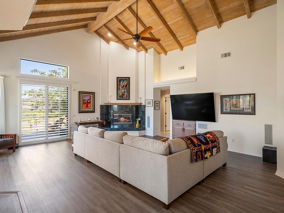 Single story home with over 2 acres of view property. Cathedral ceilings throughout the home. The living room, family room and master bedroom are all sunken. Kitchen was upgraded in 2020 with upgraded cabinets, granite countertops with marble backsplash, Thermador dishwasher and induction stove top with retractable exhaust fan, Jenn-Air double oven and GE refrigerator. Master bath was updated and entire outside structure was painted. New garage doors were installed that match the color of the front door, Cherry Red. Wood floors were added in Master Bedroom, Living Room and Family Room. Whole house fan added. Fireplaces in Living room, family room and master bedroom.