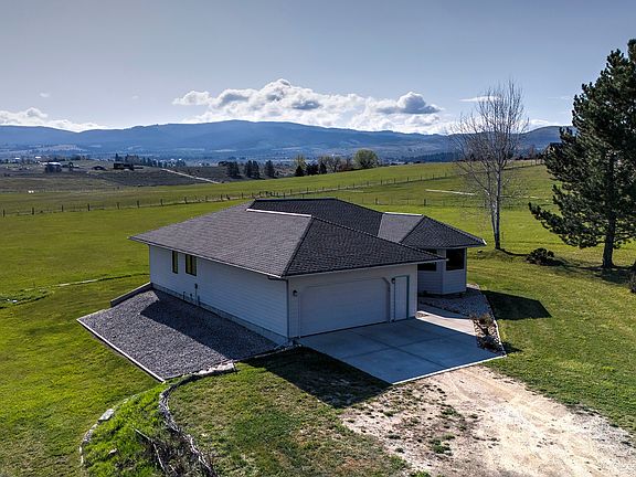 Inside, the main level showcases thoughtful updates, including quartz countertops throughout, hardwood floors, and a kitchen equipped with brand-new appliances. The windows throughout frame stunning panoramic views of the Bitterroot Mountains and Valley, flooding the open-concept living spaces with natural light and warmth. The floor plan includes two main-level bedrooms, with the spacious primary suite offering a private ensuite and walk-in closet. The lower level includes two additional bedrooms, a three-quarter bathroom, laundry, and utility room, and additional storage in the unfinished part of the basement. Whether savoring your morning coffee with serene mountain vistas or unwinding at sunset with rolling hills as your backdrop, the scenery never disappoints. Situated on 10 beautiful acres, this property could be ideal for a hobby ranch or farm. It also has the use of BRID Irrigation Water by Covenant (see attached documents for additional details).