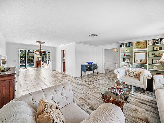 PGA National Estates - NO HOA - a hidden gem close to tons of restaurants & shopping! Expansive single level 4BR/4BA pool home, split floor plan, newer A/C & pool pump. Tile floors, multiple living areas, bay window, crown mldg, large room sizes. The chef's kitchen offers granite counter, stainless steel appliances, & large breakfast bar. Light & bright w/ 2 triple 8' sliders, CBS. Primary suite & 2 guest BR w/ensuite baths, plus 4th bedroom/den. Primary bath has double vanity, soaking tub, & dual shower heads. Chicago brick herringbone driveway. Outdoor oasis w/ pool, brick paver deck, putting green, & outdoor shower surrounded by lush privacy hedge, new fence w gate. Corian tiki hut w/ grill, fridge. Close to beaches, boating, shopping, dining, and Palm Beach International Airport