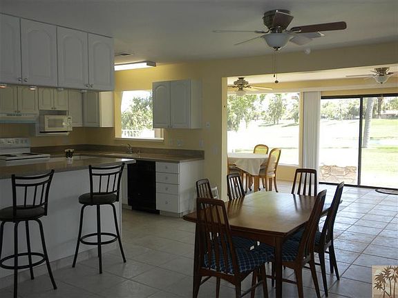Price reduction $10,000.00!!!!!!This property features spectacular Santa Rosa mountain views,it is located on the Golf course over looking two lakes with 6 waterfalls,all views are unobstructed form the full glass enclosed den.This home also features 16 inch tile flooring (no carpet),plantation shutters,newer cabinets,nice counter tops and special bar area,newer roof,newer A/C unit,fruit trees,new paint,new toilets,new showers,separate golf cart garage that leads directly onto golf course and many more good things.