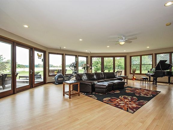 Great price on this fabulous 5 acre horse property. Stunning family room addition, updated kitchen, massive dining room, newer trex deck. 36x56 3 stall barn with water and electric (could easily be 6 stalls). USDF dressage length arena, 2 paddocks and white vinyl fence. Beautiful views backing to Forest Preserve land with miles of horse trails, surrounded by large pines for abundance of privacy. Zoned farm, must see