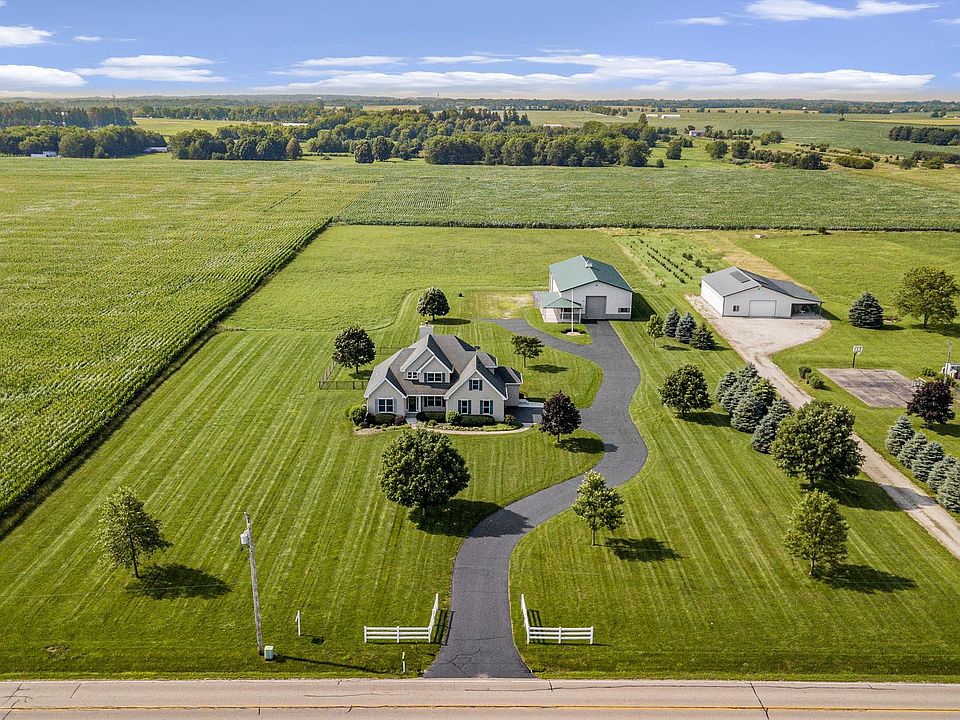 Stunning cutom home on 5+ Acres! Fabulous floor plan with high ceilings. Fireplace in the Family Room and many custom features. Generous 1st Floor Office with custom built-in bookshelves and cabinetry. Very spacious Gourmet Kitchen with Corian counter tops and large center island. Upgraded trim detail throughout. Dramatic 2-Story Foyer. Large Family Room with Fireplace and 2-Story ceilings. Spacious Master Suite with views of back acreage. Master has large walk-in closet, generous Master Bath with shower and separate whirlpool tub. 4 Bedrooms (total) - 1 bedroom has a private bath, the other 2 are served by a hall bathroom. Large utility/hobby room. Deep Pour Basement - fully excavated - great storage, easy option to finish for additional living space. BRING THE TOYS: 40x90 Morton Building - insulated - 15' ceilings, radiant heated floors, 16x12 Office, Full Bath, 3 12x14 over head doors. MUST SEE!! Too much to list. 40+ Page eBrochure.
