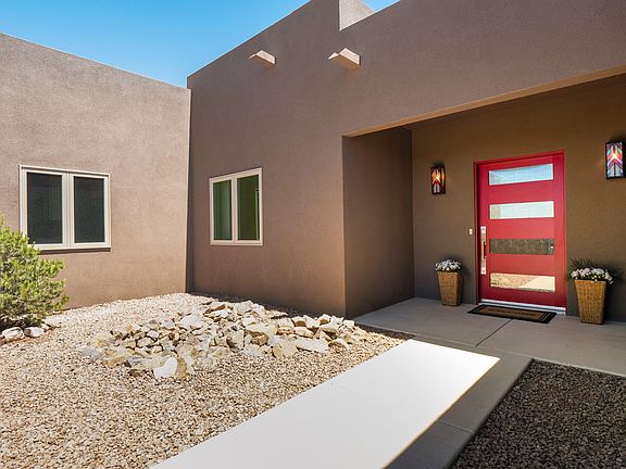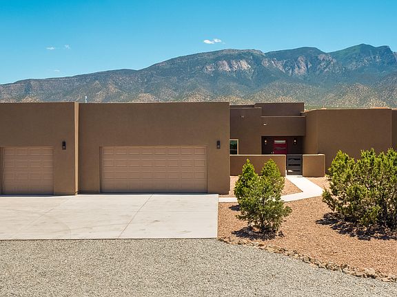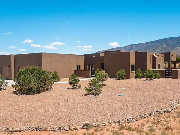 Newly constructed in Apache Mesa subdivision with jaw dropping Sandia Mountain views. Single level (no steps) 3 bedrooms (2 suites), office & great room. Multiple covered patios and expansive courtyard walls. Heated bathroom floors * Sierra Pacific windows * Montego fireplace * Fire Suppression System * Wolf range*Sub Zero refrigerator*2-Fisher & Paykel dishwasher drawers * fully landscaped w/drip irrigation system. Oversized 3 car garage with epoxy coating & 220v for EV charging. Apache Mesa backs to the Cibola National Forest with miles of trails for hiking/biking and is walking distance to the Homestead Village Shopping Center for restaurants, grocery, art gallery & more. $2,500 financing credit with Bank of ABQ (call listing broker for details). Welcome home!