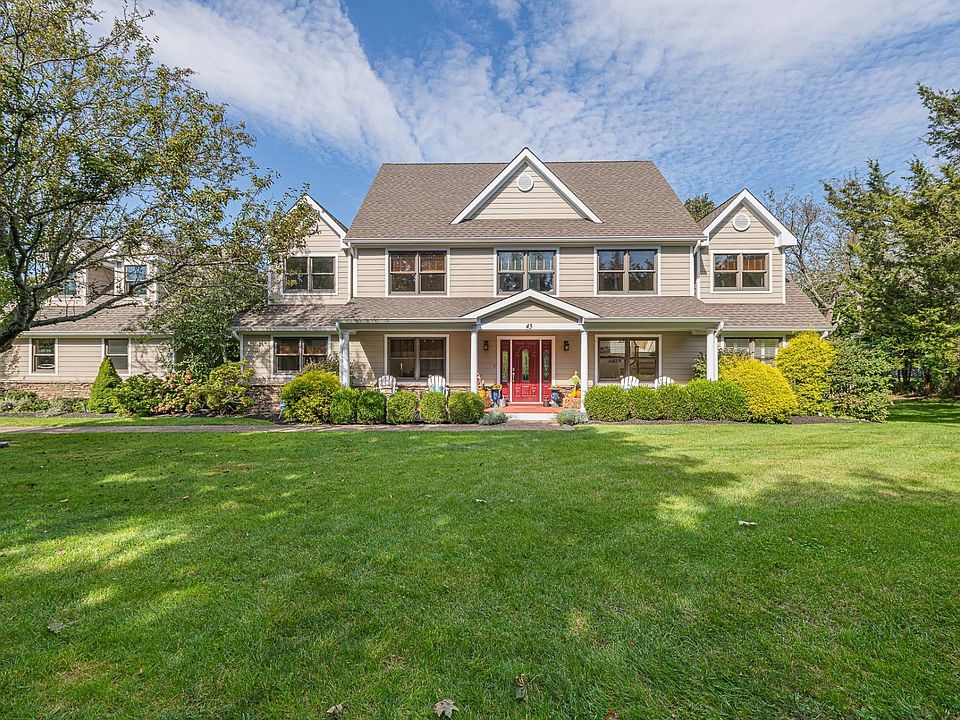 Built in 2005, this stately Village pool home provides 3,000+/- sq. ft. of living area on two stories, with five bedrooms, three full and one half baths, plus additional recreation space in the finished lower level. The crisp, well-manicured property is tucked away on a private road, minutes to Coopers Beach and Main Street. You are welcomed home from summer fun to a Belgian block-lined stone driveway with plenty of parking for guests, landscape lighting, brick walkway and charming covered front porch. The lush green oasis is set on one half-acre, and features a heated saltwater pool, large patio, fireplace, and fenced vegetable gardens. A proper mud room connects the outdoors to a two-car garage, which also offers unfinished loft space. Step inside the home to a sun-drenched living room, with volume ceilings and double height windows. Warm, hardwood floors are found throughout the main living areas and bedrooms. A light and bright foyer flows to formal dining in the front of the home, and a spacious eat-in kitchen for casual dining offers outdoor access, Shaker-style wood cabinetry, granite countertops, prep island, and stainless-steel appliances by Thermador and Bosch. Also on the first floor is a guest bedroom, full bath, powder room, laundry, and family room with French Doors. Upstairs are four bedrooms, including three bedrooms that share a full bath, and the primary bedroom which has an en-suite bath with two sinks, glass-enclosed shower and a large balcony that overlooks the verdant grounds with views that stretch across the rear of the property to agricultural reserve. The finished lower level is made for fun, with a theater, refreshment counter and popcorn machine. There's also foosball, table hockey and ping-pong. This home is move-in ready and can be offered fully furnished for your immediate enjoyment. Or, as a ready-to-lease investment property with a strong rental history.