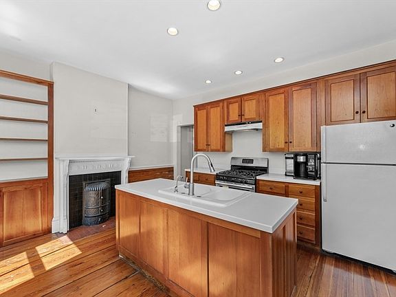 Charming and spacious three-level brick rowhouse with classic character throughout. Enjoy high ceilings with crown molding, elegant white marble fireplaces, and warm pine and hardwood flooring across all levels. The first floor features a formal dining room, an eat-in kitchen with cherry cabinets, Corian countertops, and white appliances, a tiled half bath, a mudroom, and access to a private, fenced-in courtyard—ideal for outdoor entertaining. The second floor offers a bright living room, a generously sized bedroom, and a full bath. On the third floor, you’ll find two large bedrooms, a smaller bonus room, and another full bath. All bedrooms offer ample closet space. The full basement includes laundry with washer and dryer. A rare blend of original detail and everyday functionality.