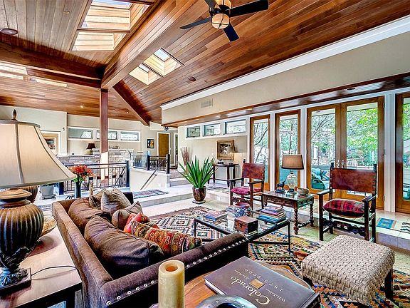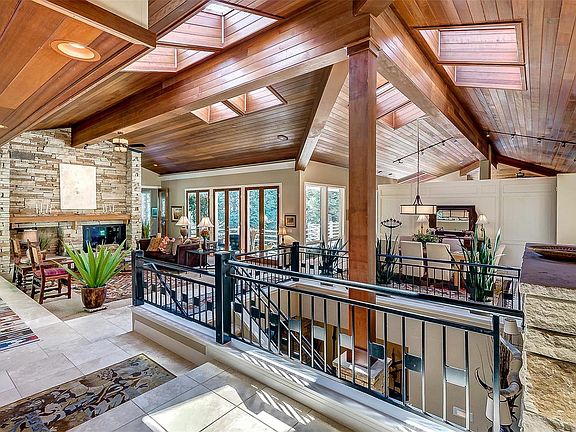 Situated at the end of a cul-de-sac, on a private, secluded 1+ acre lot overlooking the 12th Fairway of the prestigious International Golf Course, this incredible mountain modern ranch-styled home is completely remodeled & perfectly located w/in Castle Pines Village & towering pines. This home includes stunning rustic craftsmanship enhanced with an updated open, elegant, & modern design complete w/wrap-around covered decks & a partially heated driveway. Included are seamless floor-to-ceiling windows, tongue & groove redwood ceilings, extensive stone/millwork, gourmet kitchen complete with a granite waterfall island countertop, breakfast bar, Wolf stainless appliances & magnificent lower level wine cellar. This incredible masterpiece also boasts of Brazilian walnut hardwood floors, 5 fireplaces, 6 beds, 2 studies w/extensive woodwork, & 8 baths-dry sauna & steam shower. Castle Pines Village is only min. to wonderful restaurants & shopping, 15 min. to heart of the DTC and 40 min from DIA