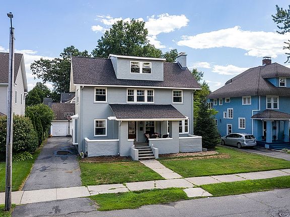 Handsome 5 BR, 2.5 bath stucco Colonial in Circle Park neighborhood. You'll love relaxing & watching the world go by from your newly re-built, blue stone front porch. Blue stone steps too! Generous living/family room with fireplace opens to the huge formal dining room w/built in corner hutches, server nook, beamed ceiling & original crystal chandelier. Butler's pantry closet, updated kitchen w/walk-in pantry, island, dining area & French door access to rear yard w/ patio/pergola. 4 bdrms on 2nd story w/ remodeled full tub/shower bathroom. Master bdrm suite on 3rd floor offers walk-in closet & private shower bath.Updated electric box has separate circuit to charge your electric vehicle/Buyer must provide charger unit. Ample backyard w/ 2 car garage. Cedar closet in basement, laundry room with cabinet storage and folding counter. Central AC on bedroom levels only; window unit on main level remains. Boiler & HWH new in 2016. Roof replaced March 2020, exterior painted July 2020. Call Today
