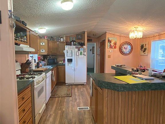 This cute inviting home on a double lot, has 2 bedrooms with there own bathrooms on opposite ends of the house. The spacious kitchen with new floors, has an island in the middle and will be the hub of your house. The yard is well taken care of and has mature aspen and pine trees and other nicely spaced trees and shrubs. The yard also has a nice chain link fence with a double gate entrance. This home includes a shed/workshop. The mobile home has been purged. Get it while it lasts.