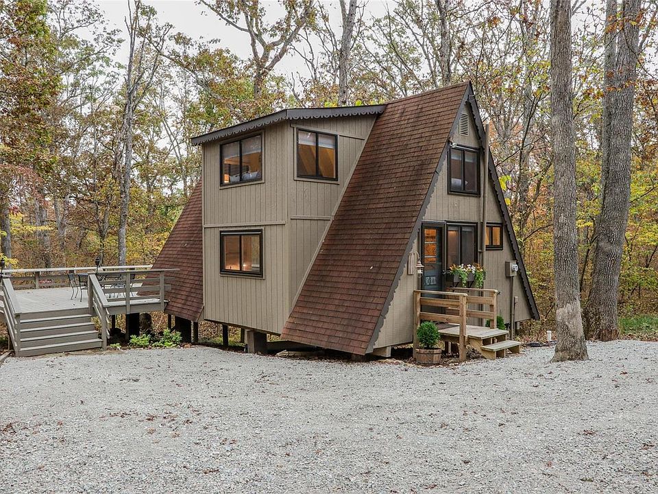 This chalet cannot be rented. open Sunday 12-2pm Contracts due 5pm Sunday Charming chalet privately situated on 3.4 acres within walking distance of a large lake beach area on Lake Lucern. The adorable kitchen recently updated with newer cabinets, a new sink and lighting fixtures along with a coffee bar area and a pantry. The dining area seats six. Beautiful great room with a fabulous wall of windows leading to an expansive deck area. The loft provides two sleeping areas. Enjoy smores by the firepit area. Fully furnished.
