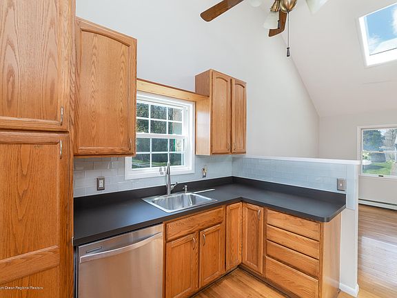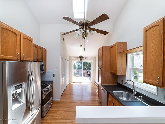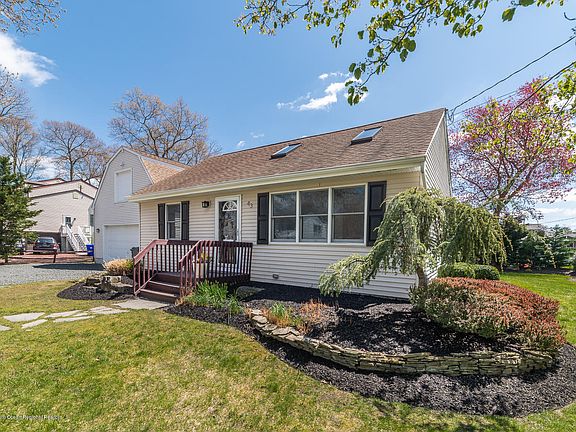 Welcome to this charming Ranch style home located in Brick. Walk in to the freshly painted open living room and kitchen with hardwood floors, vaulted ceilings and skylights that allow tons of natural light. The kitchen has stainless steel appliances, tile backsplash, room for a dinning table and sliders that lead to the back deck. On your way to the bedrooms you will find the guest bath with beautiful custom tile work. The master suite has hardwood floors, vaulted ceilings, and a private entrance to back deck and another beautiful custom tile bathroom. The 100x100 corner lot is professionally landscaped with a double wide gravel driveway that leads to a large detached 2 car garage with loft space. This house is just blocks away from the marina and close to local beache