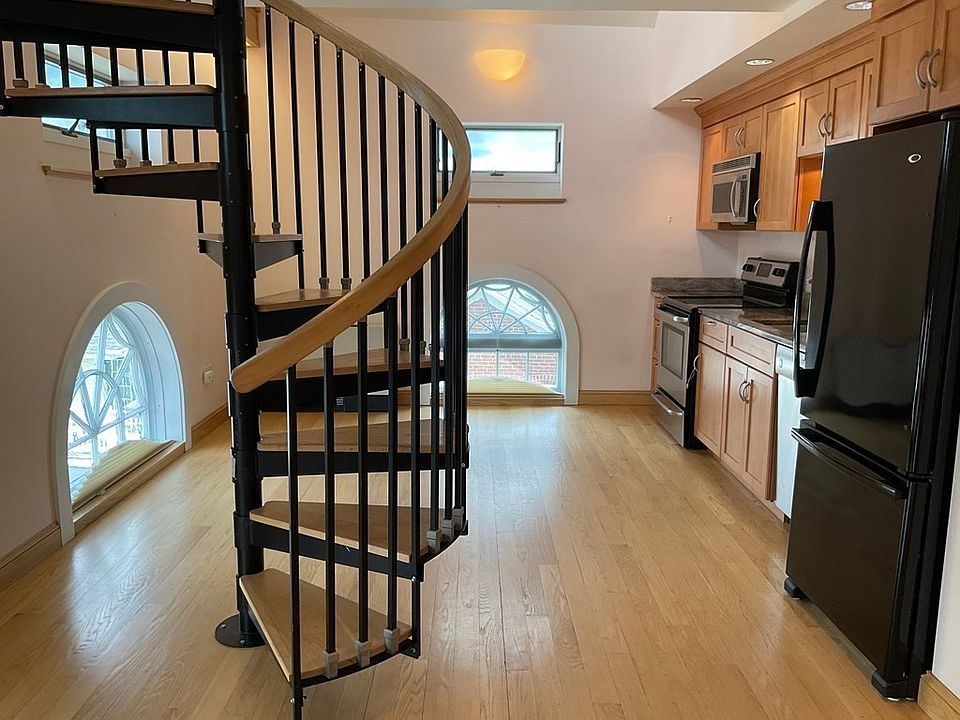 Well well, AN IN TOWN PENTHOUSE CONDO, private & QUIET with no restaurants below? Here it is! The lower level has space for living, hanging art, kitchen with dining area, mudroom/entry, & the bedroom with walk in closet. Up the circular staircase is (jaw drop) a loft for your imagination to take over…and the VIEWS through myriad Palladian windows, including a massive triangular window, are inspiring. The quality & amount of oak trim, Maple cabinetry, oak floors, and solid oak doors are beyond anything in any units in town…add the exposed beams and intriguing angles of the lofted ceilings and you have a special place to call home. RARE DEEDED PARKING SPACE. The building: sprinkler system, an elevator, is professionally managed, secure, and all 4 residential units are in the top floor and your laundry is on that same floor. Your monthly fees may appear hefty!.BUT cover Heat, Hot Water, master insurance, snow and rubbish removal, water and sewer, elevator, security, pro management!