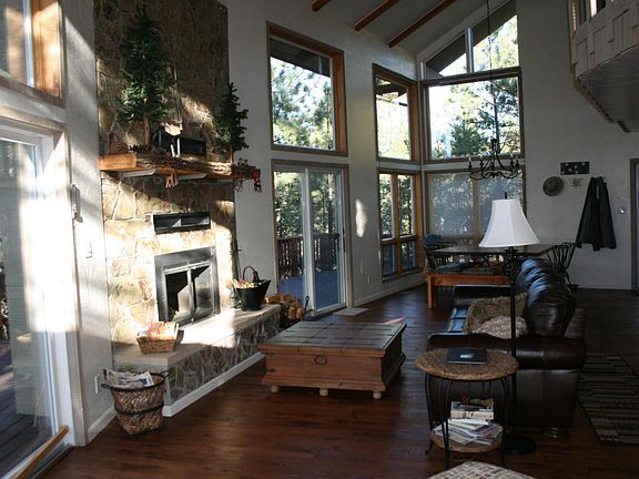 BEAUTIFUL HIGH COUNTRY CHALET CABIN ON OVER 7 TIMBERED ACRES. HICKORY HARD WOOD FLOOR ON MAIN LEVEL. PICTURES WINDOWS ALLOW NATURAL LIGHTING. ROCK FIREPLACE FOR COZY WINTER HOLIDAYS IN THE MOUNTAINS. 3 LEVEL CABIN HAS LOTS OF ROOM FOR FAMILY & FRIENDS. ELEVATED WRAPAROUND TREX DECK. HORSE PROPERTY & EASY ACCESS INTO USFS JUST A FEW MINUTES DOWN THE ROAD. UPDATED ELECTRICAL & SOME PLUMBING. ROOMY FINISHED BASEMENT WITH BD, 1/2 BA, LIVING ROOM AREA & LAUNDRY AND STORAGE ROOM. ATTACHED ONE SMALL CAR GARAGE AND STORAGE. VIEWS OF MOUNTAIN PEAKS IN DISTANCE. YR ROUND ROAD.