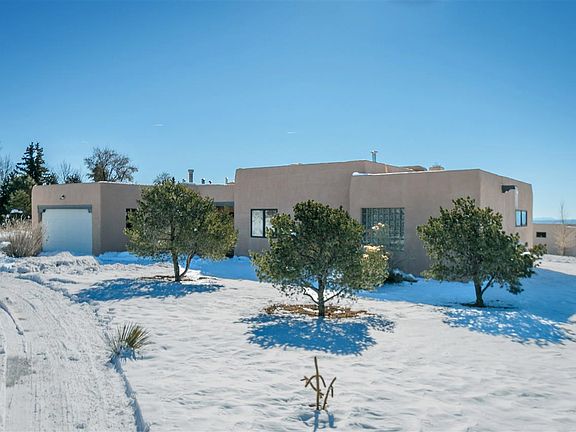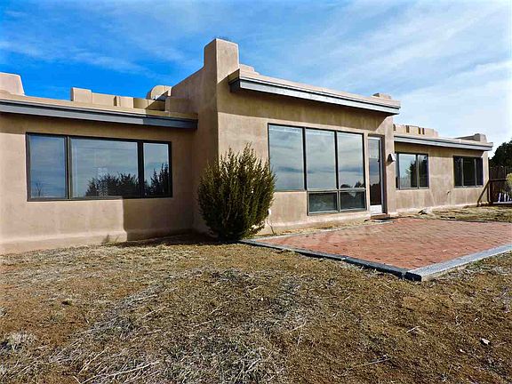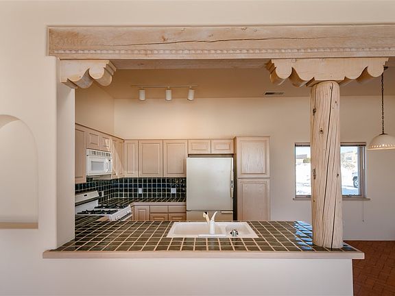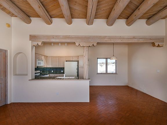 Ready to move into! Paved access all the way to this crisp and clean home. Natural gas forced air heat and central A/C. Split single level floor plan with tiled countertops, nichos, skylights, ceiling fans, brick patio. The living room has a kiva fireplace and tall viga ceiling. Brick floors in the living areas, with newly carpeted bedrooms, all with beamed ceilings. All appliances included. Over sized 2-car garage with a separate storage room.