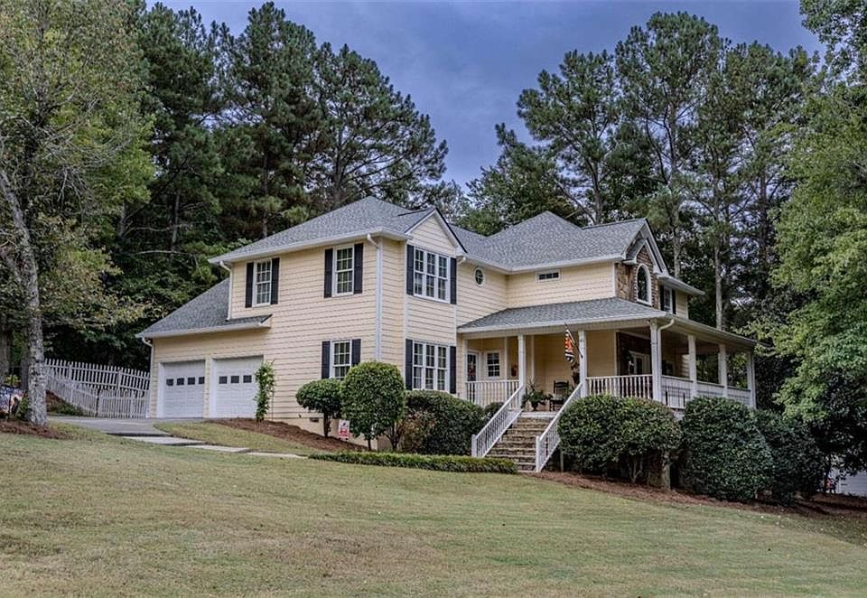This picturesque 4 bedroom 2.5 bathroom home, with charming wrap-around porch, sits on a large corner lot in the Hampton East swim / tennis community. Hardwood floors flow throughout the spacious home on both the main and upper level. Two living spaces on the main, a den and great room, offer ample space for relaxing by a gas log fire or entertaining guests. A spacious dining room sits off the remodeled eat-in kitchen. The owner's suite has a generous closet, soaking tub and double vanity. Three other bedrooms upstairs share a large full bathroom with a double vanity. A deck, accessible from the kitchen, overlooks the white picket fence backyard. A true must see!