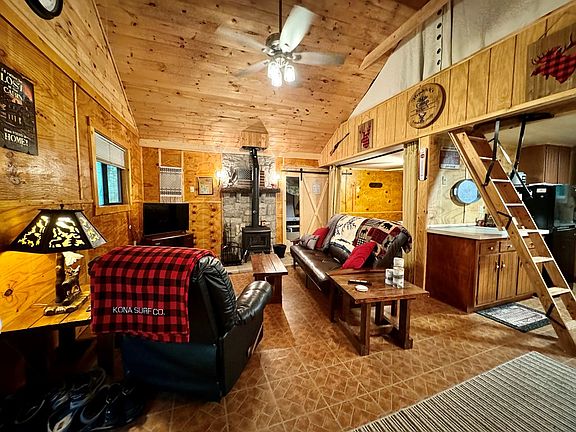 This turnkey cabin is just waiting for you to come relax and enjoy the private, wooded setting. All furniture, furnishings and decor will convey with this property. Enjoy a large bunkroom, a private bedroom area, loft space, large open living/kitchen/dining area with partially vaulted ceilings and newly added 3/4 bathroom with tankless water heater. Large garage with electric will house all your toys with additional storage shed and woodshed as well. Cozy wood stove creates warmth and ambiance during the winter and the covered porch allows you to sit and enjoy the peace and serenity that this cabin community allows. Snowmobile access on the roads and state land not far away! Great outdoor entertaining space complete with outdoor dining set, campfire, swing and ax throwing! Make this 5+ acre property yours before someone else does!