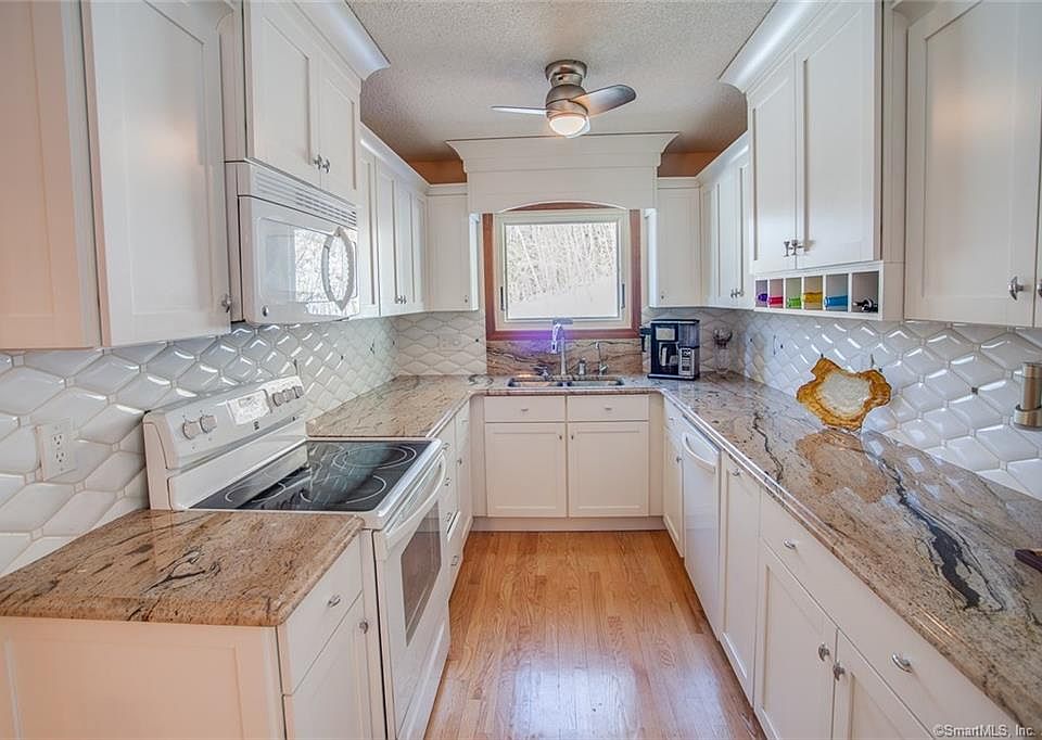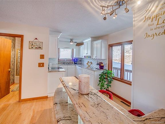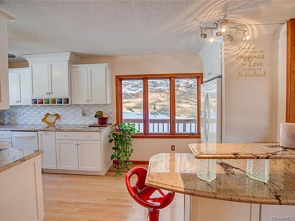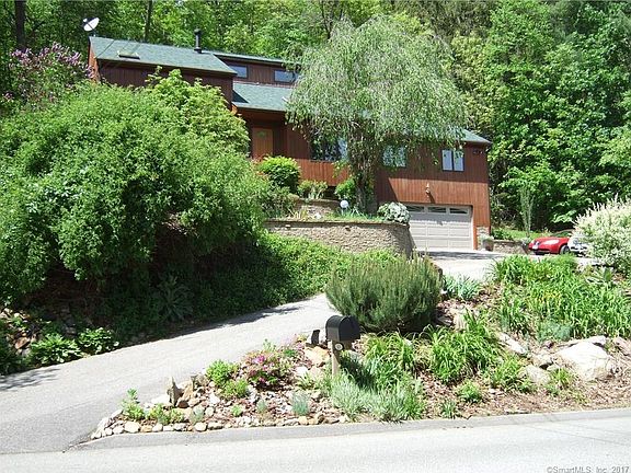 Unique and cheerful, three large bedroom, three bath contemporary home perched on a hill side has c/air, and a walk out basement and two car garage is MOVE IN READY. The updated kitchen is beautifully appointed with Italian tile back-splash, interesting granite counters, new appliances, large windows for breathtaking views, and a custom breakfast bar overlooking the family room. The family room has a see-thru wood burning fireplace for ambiance and sliding doors for easy access to the wrap-around deck ideal for outside entertaining. Entertain in your sun drenched living room with cathedral ceilings and sky lights, fine hardwood floors with custom contrasting detail, or your cozy dining room. Presently, the master bedroom is on the first floor, but get creative and have an awesome game room and move your master upstairs. The big ticket items have been done - new heating and cooling system, some new thermopane windows, a whole house generator, and new roof sporting green architectural shingles thoughtfully chosen to blend in with the lush surroundings. Stone walls, patio, and plenty of level parking for easy turn around or keep your RV. Just a stone's throw to Cranberry Bog for skating, and Airline State Park Trail. Less is more: This property will appeal to nature lovers seeking privacy and LESS LAWN maintenance. Ideal commuter location.