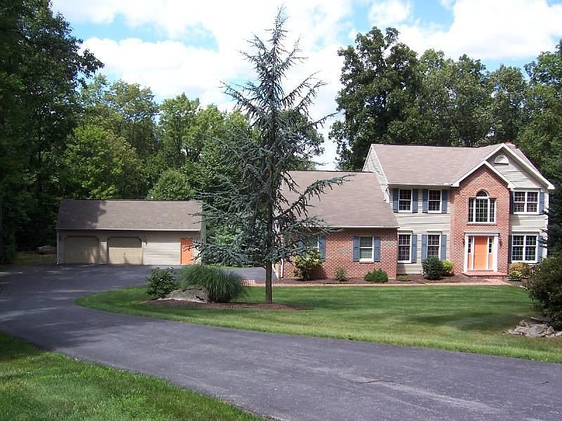 WELCOME TO PARADISE - This 4BR, 2.5BA contemporary features a 2-story entry with hardwood floors and formal living & dining rooms with lots of windows to enjoy the views. The spacious kitchen offers an abundance of pickled oak cabinetry, center island, pantry and large breakfast nook with French doors. Off the kitchen are a spacious laundry and half bath. The family room is open to the kitchen and features a brick fireplace & wide window. The MBR suite offers vaulted ceiling, sitting area, lighted walk-in closet & full bath with double sink. The huge basement, with extra high ceilings & new hot water heater, is ready to finish and offers a double French door access to the rear yard. The home features a 2-car attached garage and a 2-car detached garage. The detached garage has propane heat, electric, attic storage & an air compressor. This lovely landscaped 2.82 acre lot is 30 minutes from Bear Creek Ski Lodge and easy access to Rts. 222 & 78.