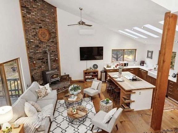 Peaceful, private and just minutes from the center of Stone Ridge and High Falls! Get away from it all, less than 2 hours from Metro NY. This contemporary home on over 5 acres with a pond sits at the end of a very quiet road. The main event is a lovely great room with cathedral ceiling, wood burning fireplace and open concept kitchen and dining area with plenty of windows to enjoy the view of the pond. The large butcher block island is perfect for guests to gather around while making a great home cooked dinner. The multi-level deck with hot tub overlooks the pond and is perfect for watching wildlife stroll through the yard. The magic continues with an ensuite bedroom with private bath and direct access to the deck and hot tub as well as another main floor bedroom and full bath. The second floor loft area has a cozy sitting room, half bath and office/den/spillover space. The newly renovated lower level of the home 1 bedroom complete with wood stove, large, full glamourous bathroom and full kitchen. Significant improvements on the property including the addition of the ground floor 1 bedroom apartment, air conditioning, some new windows, doubled the size of the usable yard, created the pond, rebuilt of all of the decks & added the hot tub and tool shed. This home is conveniently located to all the Rondout Valley has to offer including great restaurants, hiking and biking trails and local farms. Pack up your kayaks and hiking boots and start living your best outdoor life! Less than 2 hours from metro NY