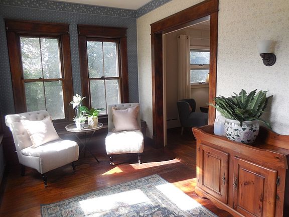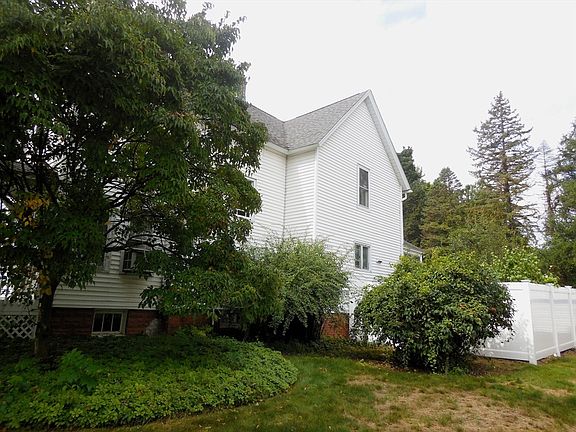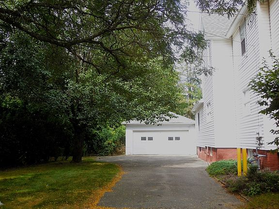 This home in Chicopee Falls has been in the same family for almost 100 years! Classic farmhouse layout with an addition of a bedroom and half bath on the first floor. Big kitchen with updates is perfect for baking! Living room has tin ceiling and oak floor and dining room has oak floors. The front porch was converted to a sunroom and is toasty on winter mornings! Second floor has a big main bedroom and a walk in dressing area. 2 other bedrooms are on this level as is the full bath. The driveway is able to accommodate at least 4 cars and the 2 car garage has a door opener. Nice yard with fruit trees and partially fenced. Nice location for easy access to Springfield!