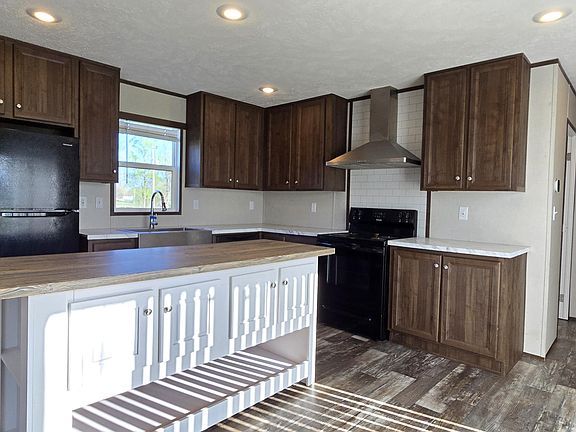 Enjoy peaceful country living in this charming 3-bedroom, 2-bath home nestled on a spacious half-acre lot. Step inside to an open-concept living area with built-in shelving, rustic wood-style flooring, and plenty of natural light. The kitchen is a showstopper — featuring rich wood cabinetry, a large island, stainless farmhouse sink, subway tile backsplash, and sleek black appliances. The primary suite offers a private retreat with a double vanity, walk-in shower, and soaking tub.