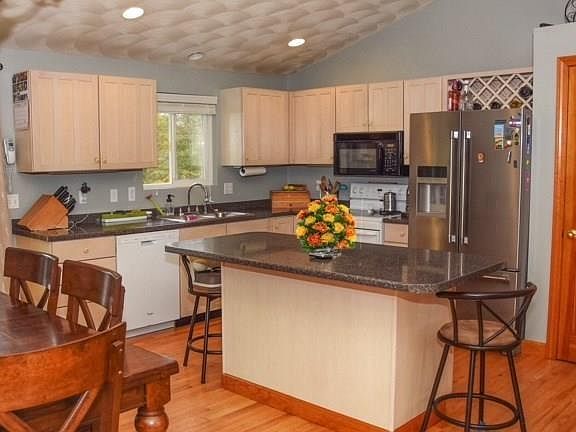 Move in condition home features hardwoods throughout, open layout, large fenced in yard, 2 car garage, finished family room in lower level and set back off road. Cathedral ceiling in kitchen, living, dining room with extra large window making the room sunny and bright, great for entertaining. Sliders to deck off dining area, large bathroom with whirlpool tub, master bedroom has sliders to private deck, upgraded electrical, solar panels and large lot!