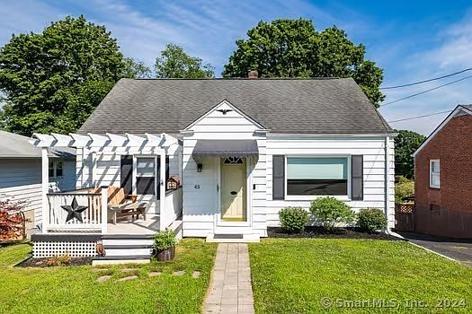 Sweet Cape Cod close to East Haven center! Charming front deck with pergola greets you as you walk towards the front entry way. Living room with warm hardwood flooring has an opening in wall to Kitchen adorned with crisp white cabinetry and sleek appliances. Newly remodeled bathroom with clean finishes. Formal Dining room could double as a fourth bedroom on the main level. One more bedroom completes the first floor. Head upstairs to two more bedrooms with new flooring. Walkout basement with natural gas fireplace heater, is perfect for an in-law setup or family room! Oversized one car garage to fit your car and outdoor tools. Easy yard to maintain with room to play! Updates include new back stairs and vinyl siding on garage. Stay cool this summer with central air and enjoy the affordable gas heat in colder weather! Don't miss out on this gem! Subject to Seller finding suitable housing, actively looking. Room sizes are approximate. Some photos are virtually staged.