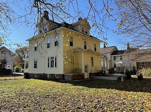 Fabulous Colonial with beautiful natural woodwork, pocket doors, 10 rooms, 4 bedrooms. 2 living rooms, one with a fireplace, dining room half bath and 5 year new kitchen with island and walk thru pantry leading to dining room, built ins, all on first floor. Second floor has 4 bedrooms, master bedroom with walk in closet, recently renovated bathroom, large closet in hall with washer and dryer. Two more heated rooms on third floor, with wide staircase and electric baseboard heat. Spacious fenced yard, shared driveway with concrete pad for off street parking or potential future garage. Lots of room for everyone in this home.