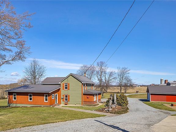Nestled between Slippery Rock & Grove City, minutes from I-79, this breathtaking 29-acre farm offers serenity & beauty at every turn. Meticulously maintained farmhouse boasts an inviting eat-in kitchen at its heart. Vaulted great room w/recessed lighting features propane fireplace & stunning picture window overlooking water gardens leading to scenic 1-acre pond. Step onto screened porch & start your mornings w/peaceful fountain views. Hand-scraped hardwoods grace in living room, leading to 1st-floor primary suite w/spacious walk-in closet & built-ins. Upstairs, find 2 bedrooms, office, & spa-like bath. Lower level game room w/wet bar is great place to unwind next to stone wrapped electric fireplace. Storage abounds w/2 detached garages-40x60 equipment garage & additional garage & 30x28 workshop w/full bath, all under a newly updated 1-bed, 1-bath apartment that could be expanded into 29x28 storage next to it. Expansive fields, lush gardens, & wooded acres complete this dream retreat.
