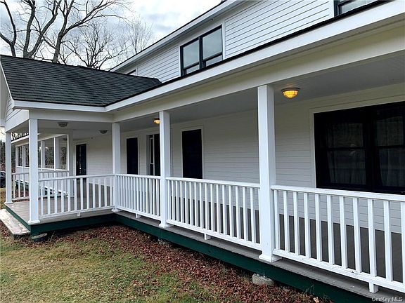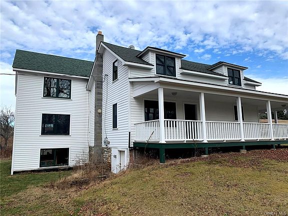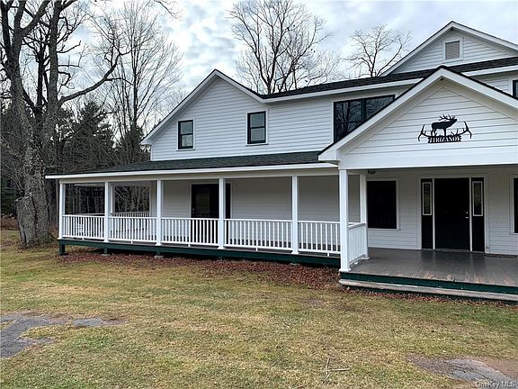 There's room for all in this enormous farmhouse with a lodge-like feel and 7+ bedrooms on over 60 acres! On a quiet country road, this well-built and well-maintained home stands out with its clean lines and pleasing white exterior. From the inviting wrap-around porch, enjoy the sweeping views of both farmland and forest. A number of doors lead from the porch into the home, but the main entrance leads to one of two enormous living spaces with a soaring ceiling and an abundance of windows bringing in natural light. Three separated bedroom suites allow for much privacy amongst guests plus even more space with the 1500 square foot finished basement with slate flooring. Granite countertops, the impressive great rooms, and a gorgeous floor to ceiling river rock fireplace are some of the lovely amenities you ll find in this home. Plenty of storage space throughout. Just 10 minutes outside of Narrowsburg and the beautiful Delaware River and very central in the Sullivan Catskills.