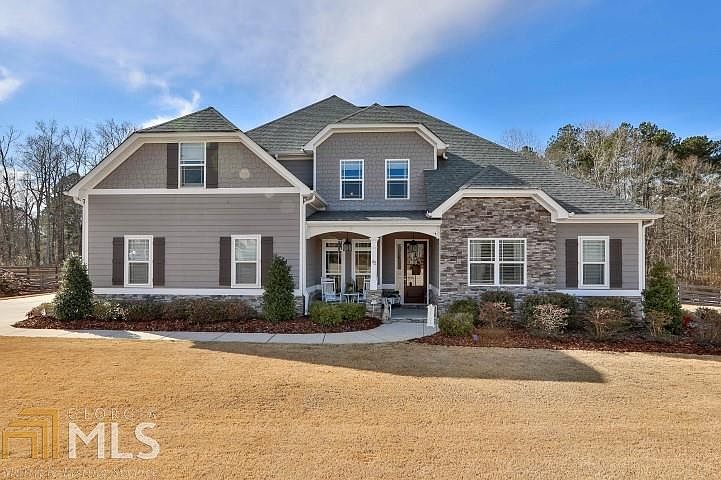 Spectacular home with 5 bedrooms/4 bathrooms that feels like home as soon as you arrive, located far enough out to have privacy and still conveniently located for shopping and activities. Coffered ceilings, open floor plan, HUGE granite kitchen island, grand family room fireplace and many more stunning upgrades. The kitchen boasts custom cabinetry that is continued throughout the home. The master bedroom is on the main level and has plenty of room to spare along with a double vanity master bathroom and tile floors. The second floor features 3 bedrooms/2 bathrooms and a huge separate office/playroom space overlooking your gorgeously landscaped backyard. The entire lawn is irrigated and professionally landscaped with a custom fire/sitting paver patio to take in all the beauty. The outdoor covered patio features a beautiful fireplace ready for all your gatherings. Don't forget there is a 20x22 two car detached garage for additional storage and to make room to park your family's favorite toys! This property also has access to 15 acres of greenspace and a fully stocked fishing pond for having fun outdoors. Upgrades and quality were not left to question at this home!! Must see to appreciate!