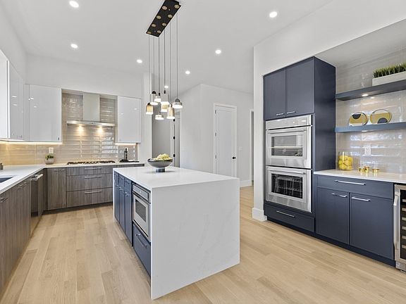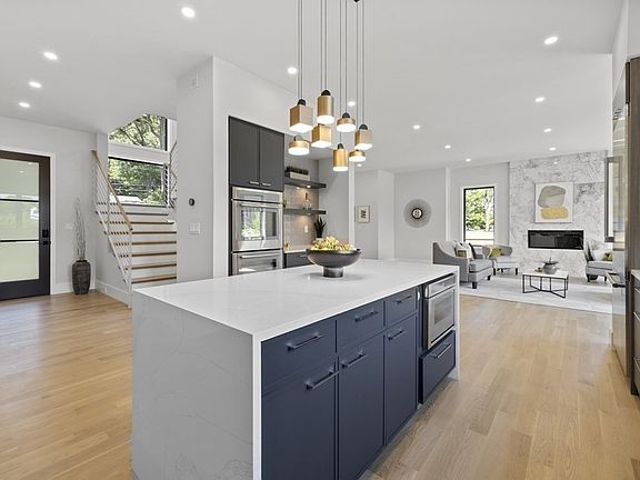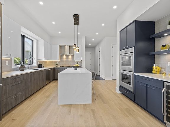 Stunning and eye catching contemporary home ready for you to move in! This five plus bedroom with spectacular windows on all four floors creates a treehouse effect from inside. From the third floor office/playroom or getaway space with wet bar and half bath, the views are treetops. On the second floor, four en-suite bedrooms with an epoch primary bath and oversized shower. A cozy nook for homework area or a library corner. First floor enjoys open concept to the fullest with two tone kitchen and large island. Family room with tiled fireplace floor to ceiling and formal or informal dining space, whatever you want. There is also a first floor bedroom option or home office, complete with full bath. A large mudroom area and plenty of storage. In the lower level, great space for playroom, extra bedroom, exercise area with super high ceilings. The design choices are over the top and you will fall in love. All of this plus a great yard in a great neighborhood. Easy commuting location!