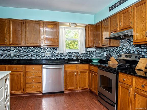 Beautifully updated and maintained 2 bedroom, 1.5 bath townhouse. Almost 1400SF of living space. Kitchen has stainless steel appliances and granite counters. Laminate wood flooring throughout the main level, large living room and dining room with sliders to a private patio perfect for grilling or relaxing. Laundry is conveniently located on the upper level with large hall bath and 2 bedrooms. The first bedroom has a ceiling fan, laminate floors, a vaulted ceiling and a large closet. The master bedroom has 2 closets (one walk in) and features a ceiling fan, vaulted ceilings and a skylight. Bathroom can be accessed from the hallway or the master bedroom. The upstairs hallway also features an open area perfect for an office or sitting area, complete with lighting and ceiling fan. Attic has pull down stairs for all your storage needs. This quiet complex has a large parking area, and is located minutes from I-84, the Danbury Fair Mall and City Center Danbury. Only 1 mile to the Danbury Train Station!