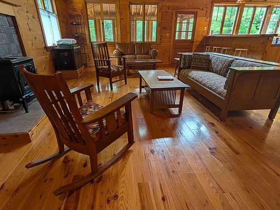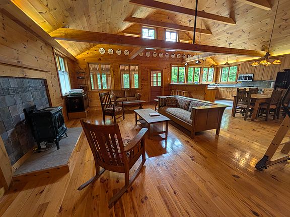 The Nest is your dream winter getaway in North Woodstock. With vaulted ceilings, river views, mission style furniture and cozy lighting - the tree house feeling common area will be a great place to share meals, make memories and unwind. For a little competition, head to the game room for some foosball or ping pong. Sleep deeply in one of four bedrooms (sleeps 12) and freshen up in one of 3.5 baths. The large entry way has plenty of room to organize your winter gear after a day of skiing or hiking and there's even a bonus room that could be used as an office if work needs to be done.