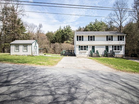 Located in the town of Bernardston and a short drive away from Crumpin Fox Golf Club, is this duplex style home at 43 Martindale Road. This is a rare opportunity to own a duplex in this beautiful rural town. Duplex’s are a great way to become a homeowner, because you can live in one side and rent out the other for passive income. This home offers a nice location with woods across the street and a neighbor on just one side. There is even a shed that doubles as a playhouse. This home has a total of 2100 square feet of living space on 1.72 acres. Each unit consists of a living room, a dine-in kitchen with access to a private deck, and a half-bath on the first floor. This unit has hardwood floors in the kitchen and the half-bath. The second floor of each unit consists of two bedrooms and a bathroom. There is one oil-fired boiler with a heating zone for each unit, which heats the respective first floors and second floor bathrooms. The bedrooms have electric baseboard heat.